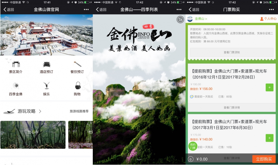 微景通自2016年始,為國家5A級風景區金佛山提供智慧景區開發建設及運營服務,在雙方精誠合作下,如今金佛山風景區的在微信智慧景區建設上成就喜人:合作期間,微景通專注于金佛山景區品牌營銷,為景區電子票務服務量身定制了微信購票系統;打造了囊括景區介紹、游玩攻略、酒店預訂、餐飲預定、娛樂購物的線上服務聚合平臺;同時策劃實現了包括金佛山景區微官網、“四季金佛”H5在內,形式多樣的移動端營銷傳播矩陣。一舉打通了廣大游客線上社交分享、線下游覽購物的互通渠道,極大地豐富了旅游景區實虛結合、不同使用場景相交融的互動體驗。實現了傳統旅游產業向移動端、新媒體領域的滲透與互融,實現了景區影響力在互聯網領域的延伸與發散。
